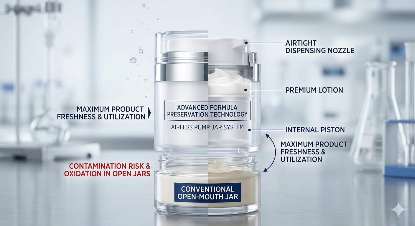 Hovedårsaken til bransjeskiftet er det luftløse pumpeglass forlenge holdbarheten til konserveringsmiddelfrie og naturlige hudpleieprodukter betydelig ved å eliminere lufteksponering. Ettersom forbrukerne krever "ren skjønnhet" med færre syntetiske stabilisatorer, må emballasje ta over rollen som beskyttelse. Tradisjonelle krukker lar oksygen komme inn hver gang lokket åpnes, noe som fører til rask nedbrytning av aktive ingredienser som vitamin C, retinol og ulike botaniske oljer.
